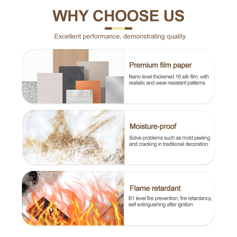 سهولة التركيب، حماية البيئة، مرنة، قابلة للانحناء، عالية الكثافة، قابلة للطي. مقاومة للحريق + مقاومة للماء + مقاومة للرطوبة + مضادة للخدش + امتصاص الصوت، مقاومة للعفن. خفيفة الوزن. قوام واضح، مجموعة متنوعة من الألوان، إلخ.