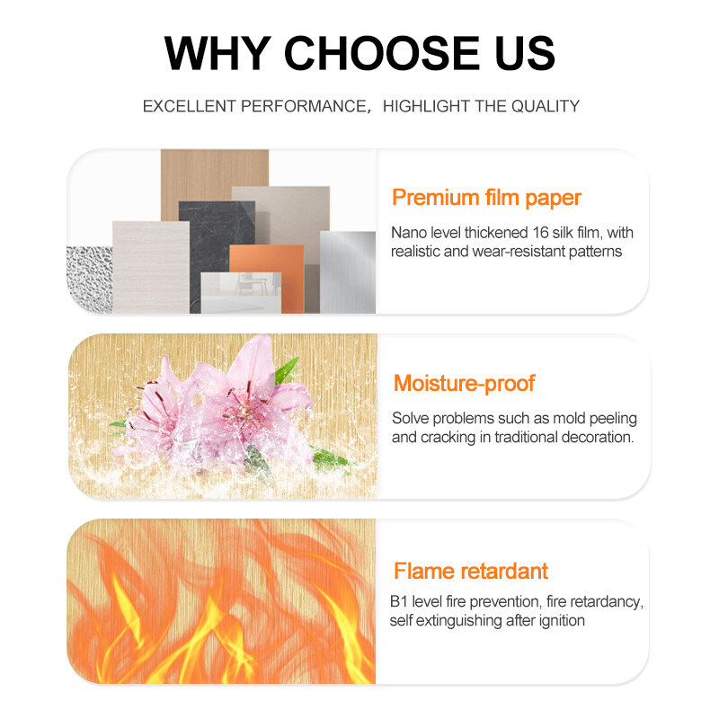 سهولة التركيب، حماية البيئة، مرنة، قابلة للانحناء، عالية الكثافة، قابلة للطي. مقاومة للحريق + مقاومة للماء + مقاومة للرطوبة + مضادة للخدش + امتصاص الصوت، مقاومة للعفن. خفيفة الوزن. قوام واضح، مجموعة متنوعة من الألوان، إلخ.