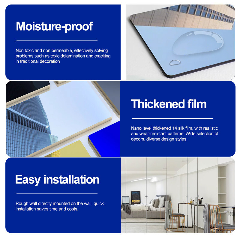 سهولة التركيب، حماية البيئة، مرنة، قابلة للانحناء، عالية الكثافة، قابلة للطي. مقاومة للحريق + مقاومة للماء + مقاومة للرطوبة + مضادة للخدش + امتصاص الصوت، مقاومة للعفن. خفيفة الوزن. قوام واضح، مجموعة متنوعة من الألوان، إلخ.
